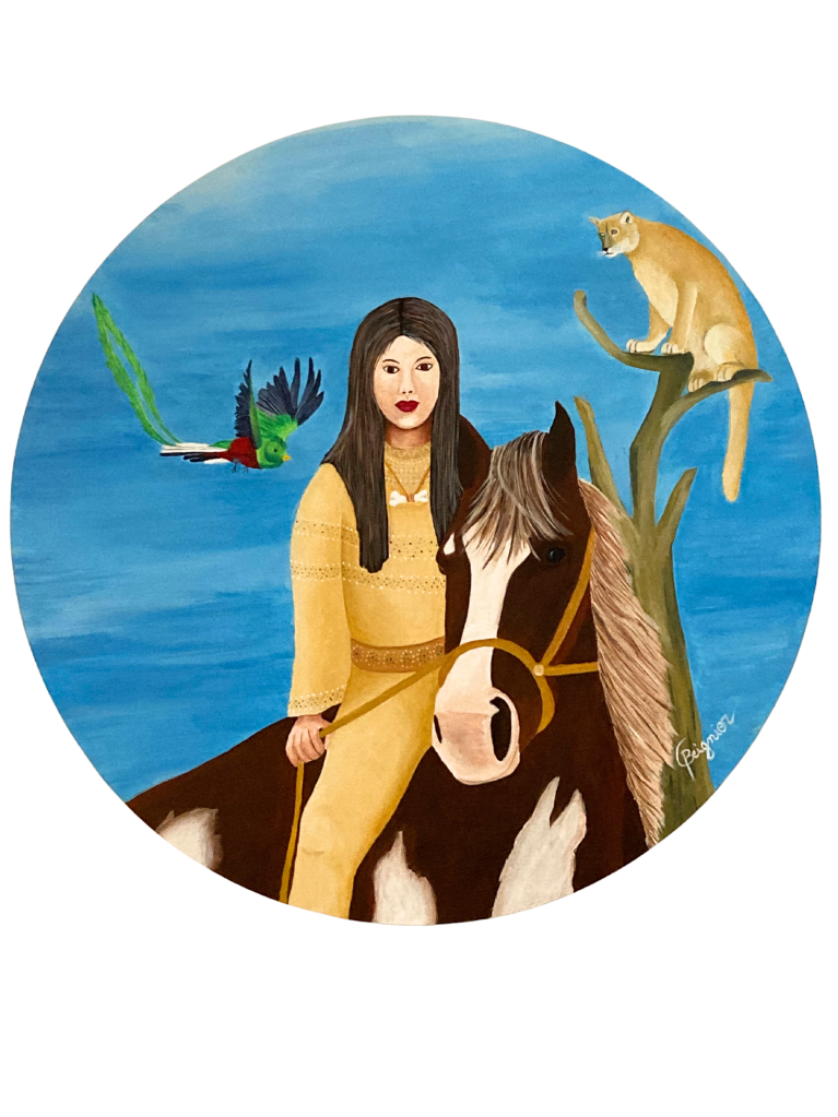 J’ai choisi de représenter à l’acrylique chaque Mère de Clan sur des toiles rondes de 50cm en forme de bouclier et aussi de tambour pour exprimer le battement de Cœur de Mère Terre.